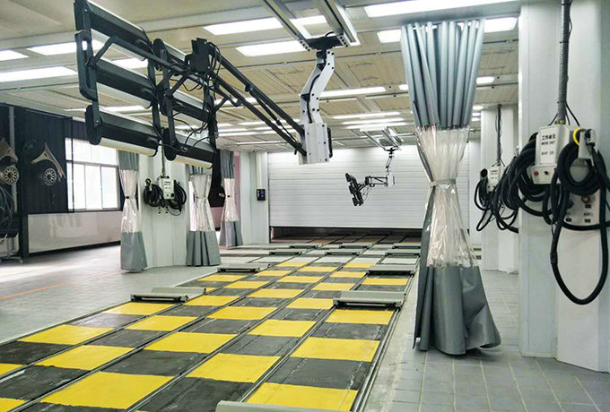 2、流水線工藝形式:大鈑金→小鈑金→局部刮膩?zhàn)印佔(zhàn)痈稍铩鍧崱鷩姷灼帷灼岷娓?局部) →中涂 →烘干→清潔→噴面漆→流平→面漆干燥。